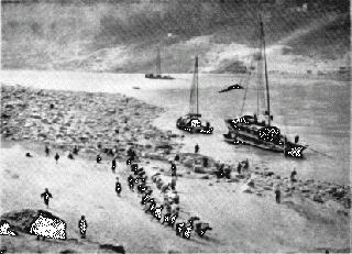 | + | Vitorlaszárnyon repült tovább a dzsunka. A parton szénrakások, ezernyi embert foglalkoztató mészégetők vannak. | ||