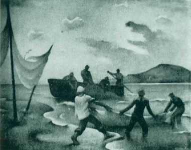 Dehát ez talán érthető is, s valljuk meg, a Balaton pillanatonként változó színtüneményeivel, partjának szeszélyeivel nagy, nehéz és tiszteletreméltó feladat az ábrázolásra, arcképének megfestésére, amihez csak a művész őszinte alázatával lehet közeledni, s a berényi telep művészei becsületes módon, jó ízléssel felmérték e téma rendkívüli nehézségeit. Tegyük hozzá, hogy épp a kevés balatoni vonatkozású művek között kimagasló darabokat láthatunk. Egyelőre azonban még Berény, emberei, a Malomvölgy, a szőlőhegy a főszerepet játszó téma, s legfeljebb egy széles rálátás a Balaton messzibe vesző keskeny csíkjára, a fűzfői öbölre. Mindenesetre épp a nagy tó még annyi festői lehetőséget rejteget a Berényieknek, annyi eddig kihasználatlan alkalmat, hogy ez egymagában biztosítja a telep reményteljes jövőjét.